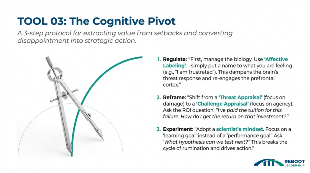 We call this protocol The Cognitive Pivot. It consists of three steps: Regulate, Reframe, and Experiment.