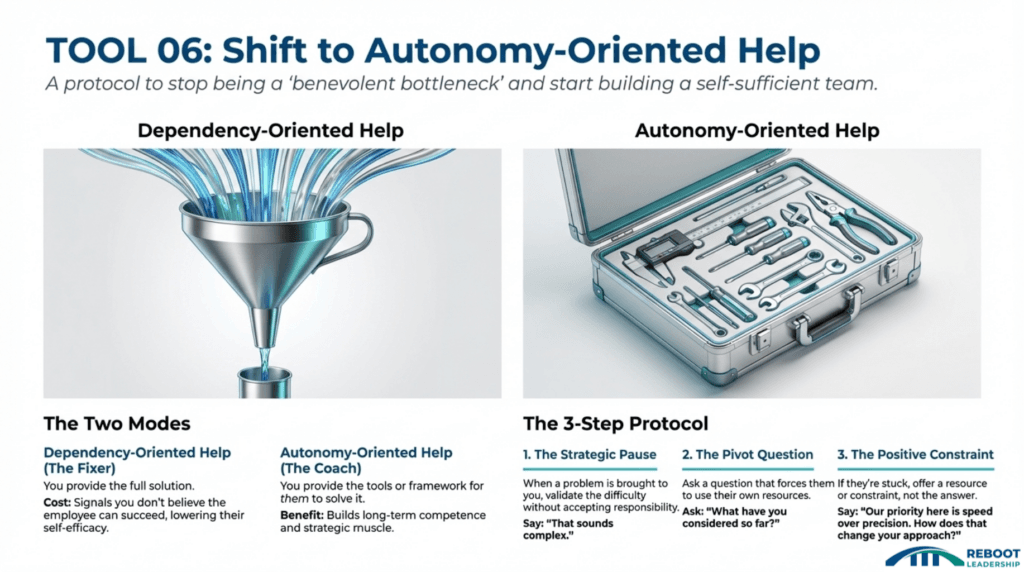 Autonomy-Oriented Help: You provide the tools, the framework, or the question that allows them to solve the problem. You teach the man to fish. This takes more time upfront and requires patience, but it builds competence and prevents the problem from bouncing back to your desk.
